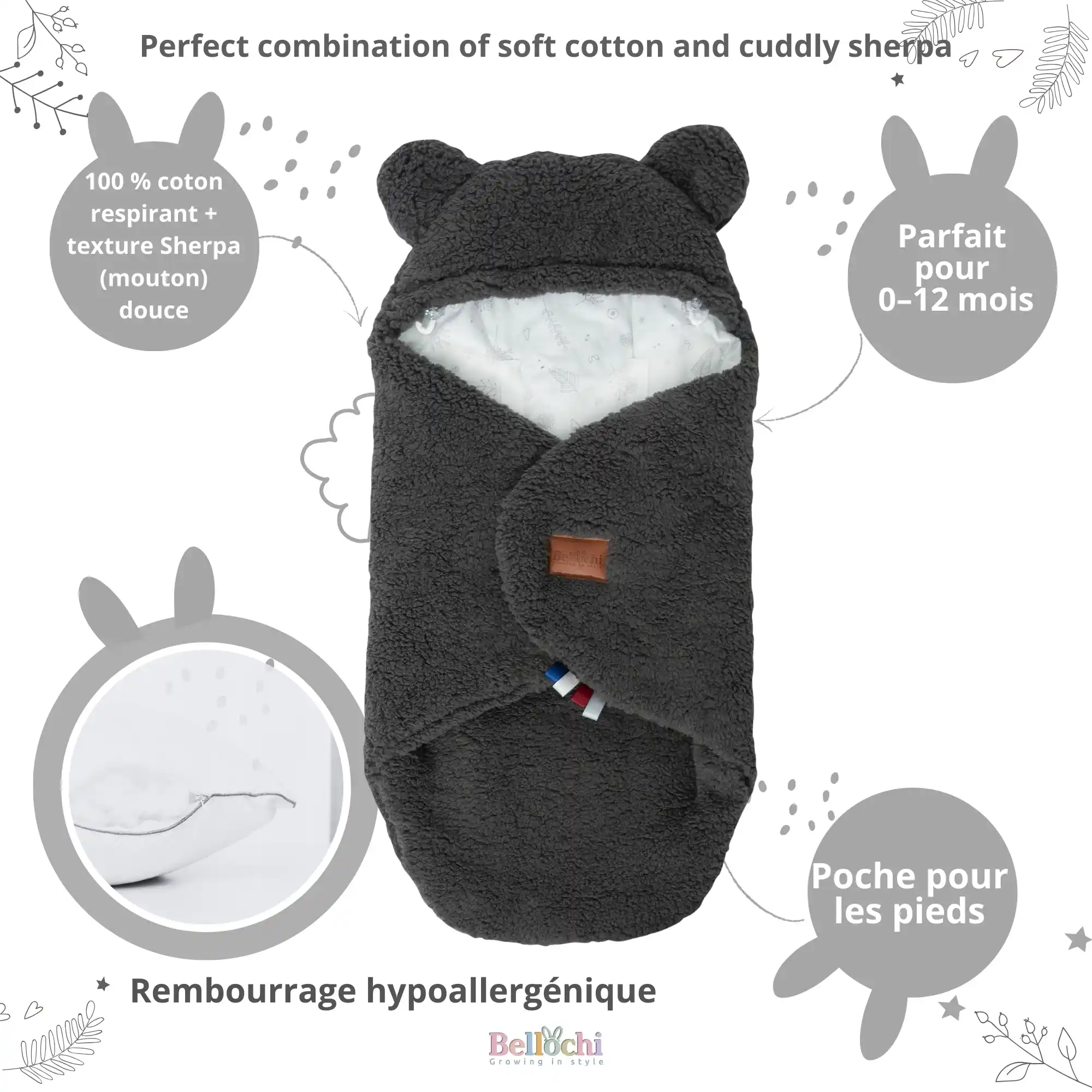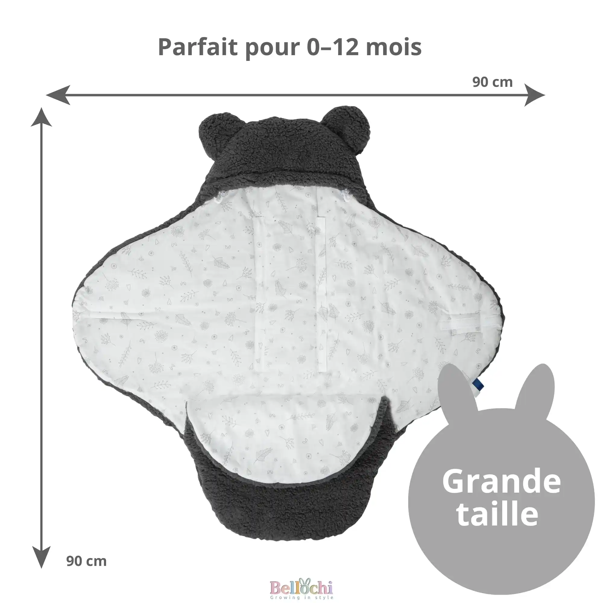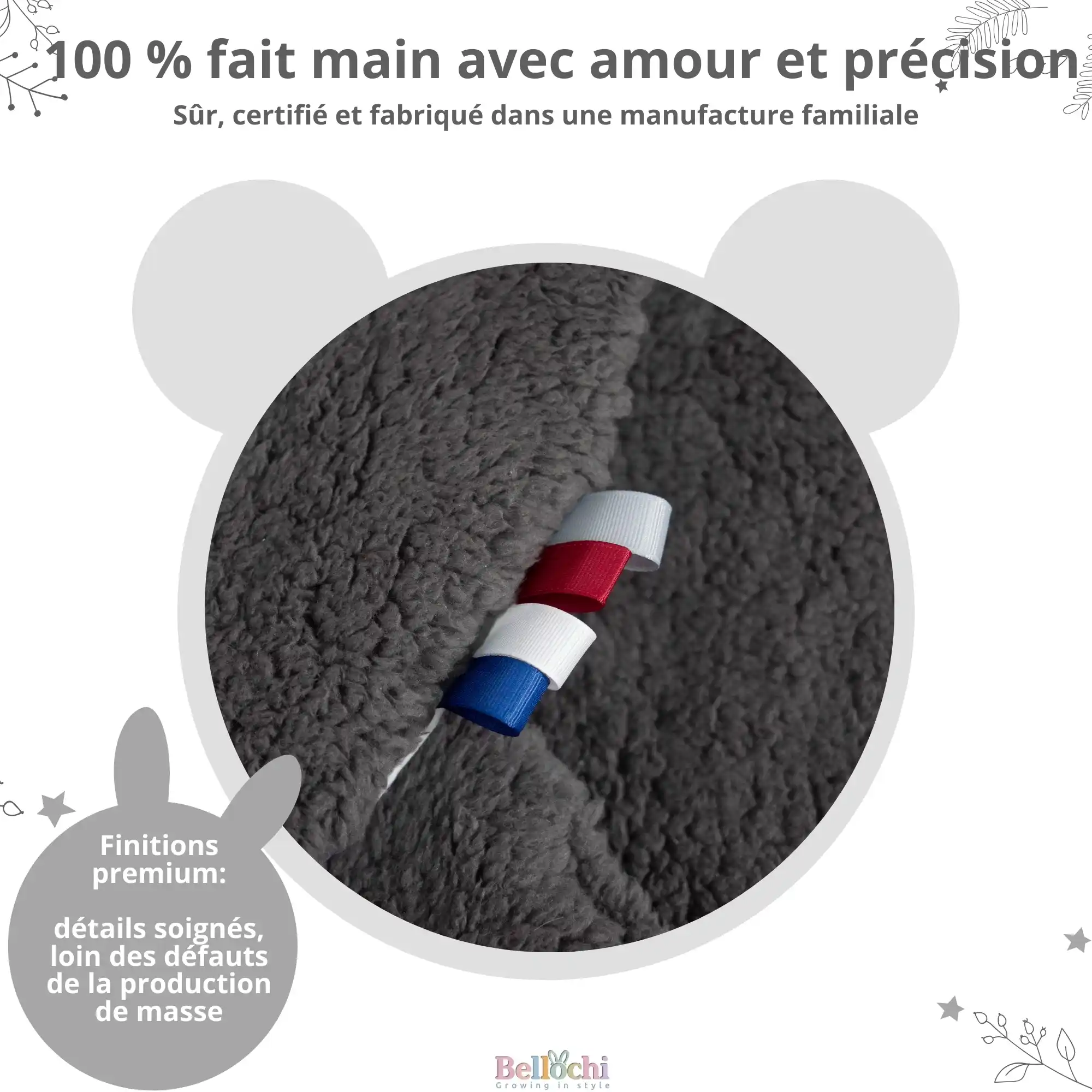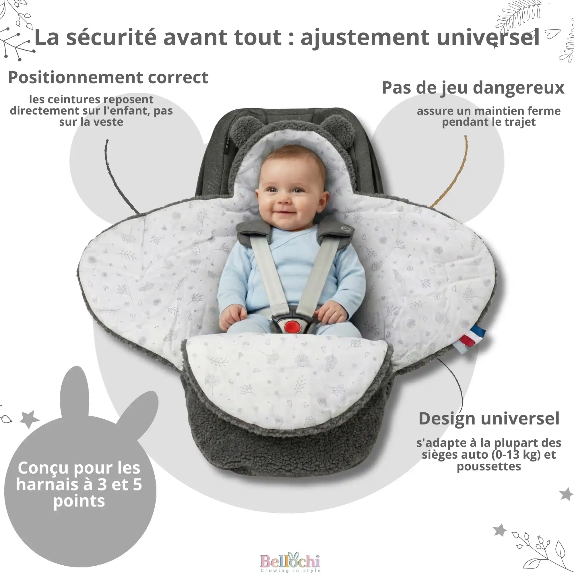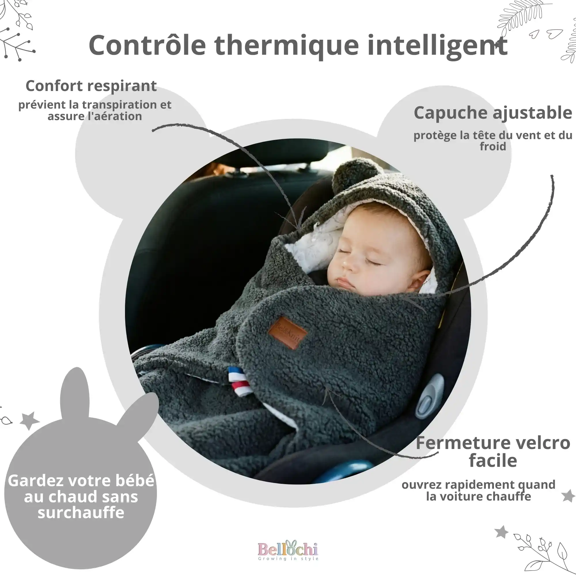 Couverture Nomade Teddy de Bellochi. Idéale pour les sorties en voiture (sièges 0-13 kg) ou les promenades en poussette, cette couverture enveloppante est la solution parfaite pour remplacer les combinaisons épaisses et encombrantes.